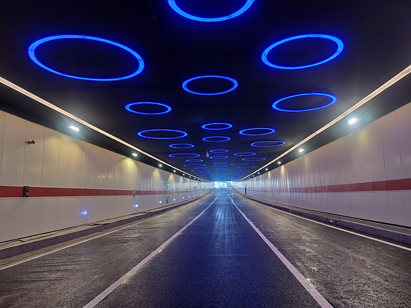 在隧道裝修方面,入口設(shè)置形如天鵝展翅遮光棚,改善進(jìn)出隧道行車(chē)視線(xiàn);隧道內(nèi)白墻黑頂,紅色腰線(xiàn)伸向遠(yuǎn)處,內(nèi)頂鑲嵌圓形LED燈飾,如湖底映射的一個(gè)個(gè)藍(lán)色漣漪。