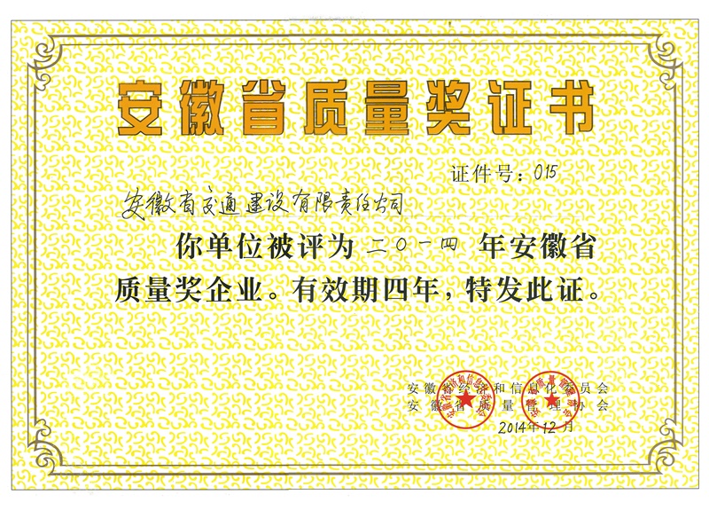 安徽省質量獎證書